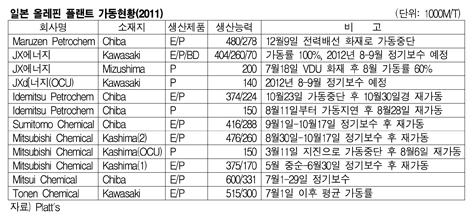 표, 그래프: < 일본 올레핀 플랜트 가동현황(2011) > <화학저널 2011/12/19> |