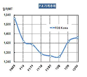 P-X 가격은 12월16일 FOB Korea 톤당 1444달러로 15달러 상승했다.