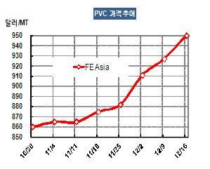 PVC 가격은 12월14일 CFR FE Asia 톤당 950달러로 23달러 상승했다.