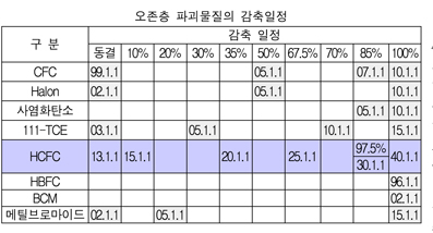 표, 그래프: < 오존층 파괴물질의 감축일정 > <화학저널 2011/12/21> |