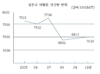 2011년 일본의 에틸렌(Ethylene) 생산량이 700만톤을 하회할 것으로 예상된다. 에틸렌 생산량은 2008년 13년만에 688만톤으로 줄어든 후 아시아 수출 증가로 2010년 겨우 700만톤대를 회복했다. 표, 그래프: < 일본의 에틸렌 생산량 변화 > <화학저널 2011/12/21> |