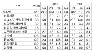 중화학공업의 노동생산성이 크게 줄었다. 중화학공업은 3.1% 증가로 전년동기 11.5%에 비해 대폭 하락했다. <화학저널 2011/12/23> |
