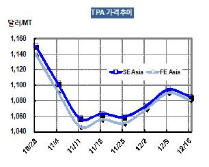 다운스트림인 폴리에스터(Polyester) 시장 또한 생산-판매 비율이 12월 2째 주에 비해 300% 가량 줄어들어 60% 근처로 떨어짐으로써 PTA 약세를 견인했다. 표, 그래프: < TPA 가격추이 > <화학저널 2011/12/23> |