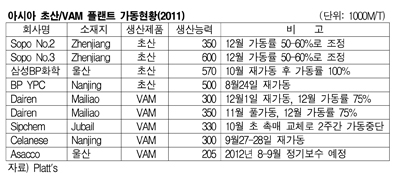 VAM 시장도 공급이 넘치자 감산하고 있다. 표, 그래프: < 아시아 초산/VAM 플랜트 가동현황(2011) > <화학저널 2011/12/23> |