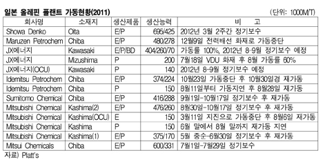 표, 그래프: < 일본 Olefin 플랜트 가동현황(2011) > <화학저널 2011/12/23> |