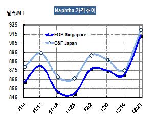 나프타 가격은 12월23일 CFR Japan 톤당 920달러로 45달러 급등했다.