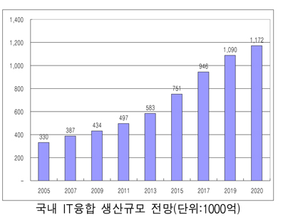 표, 그래프: < 국내 IT융합 생산규모 전망(단위:1000억) > <화학저널 2011/12/26> |