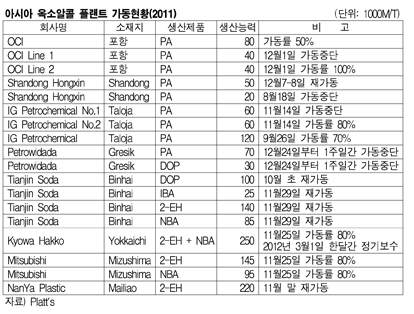한편, Tianjin Soda는 Binhai 소재 2-EH(Ethylhexanol) 14만톤 플랜트와 NBA(Normal Butyl Alcohol) 25만톤 플랜트를 11월29일부터 재가동했으며, NanYa Plastic도 Mailiao 소재 2-EH 22만톤 플랜트를 11월 말부터 재가동에 돌입함에 따라 아시아 옥소알콜 공급과잉이 예상된다. 표, 그래프: < 아시아 옥소알콜 플랜트 가동현황(2011) > <화학저널 2011/12/26> |
