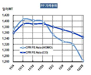 PP 가격은 12월21일 CFR FE Asia 톤당 1264달러로 56달러 폭락했다.