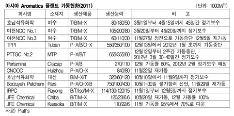 TPPI도 Tuban 소재 P-X 55만톤과 함께 벤젠 35만톤 및 O-X 10만톤 생산을 12월13일부터 2012년 1월까지 중단한다. 표, 그래프: < 아시아 Aromatics 플랜트 가동현황(2011) > <화학저널 2011/12/27> |