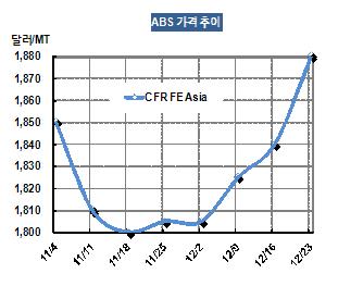 ABS 가격은 12월21일 CFR FE Asia 톤당 1880달러로 40달러 상승했다.