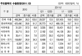 표, 그래프: < 주요품목의 수출동향(2011.12) > <화학저널 2012/01/02> |