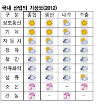 대한상공회의소는 산업별 단체와 공동으로 <2012년 산업기상도>를 통해 “정보통신ㆍ기계는 <맑음>, 자동차ㆍ정유는 <구름 조금>, 철강ㆍ석유화학ㆍ섬유는 <흐림>, 조선ㆍ건설은 <비>”라고 1월5일 발표했다.
