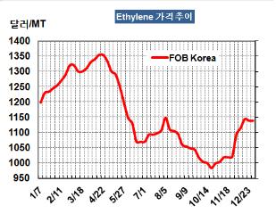 에틸렌 가격은 FOB Korea 톤당 1140달러로 2011년을 마무리했다. 일본 대지진으로 동북아시아 시장이 수급타이트를 나타내며 에틸렌과 나프타 가격이 2/4분기까지 동반상승을 지속했으나 5월 들어 정상화되면서 공급과잉으로 전환돼 하락국면으로 접어들었다. 표, 그래프: < Ethylene 가격추이 > <화학저널 2012/01/05> |