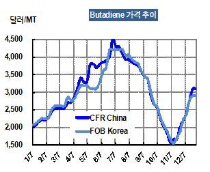 부타디엔 가격은 기록적인 폭등과 폭락을 보인 후 FOB Korea 톤당 3100달러로 2011년을 마감했다. 특히, 중국이 자동차 수요신장률을 15%로 예측하면서 부타디엔 수요 동력으로 작용해 4월 3000달러를 가볍게 넘어서더니 6월 중순에는 4000달러를 돌파했다. 표, 그래프: < Butadiene 가격추이 > <화학저널 2012/01/05> |