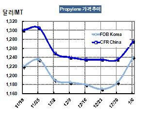 프로필렌 가격은 1월6일 FOB Korea 톤당 1240달러로 55달러 급등했다. 그러나 동북아시아 프로필렌 시장이 공급과잉 양상을 지속하고 있어 계속 상승하기는 어려울 것으로 예상된다. 표, 그래프: < Propylene 가격추이 > <화학저널 2012/01/10> |