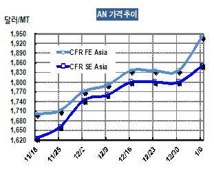 AN 가격은 1월2일 CFR FE Asia 톤당 1940달러로 95달러 폭등했다. 구정연휴가 끝나는 1월 말 이후에는 태광산업이 울산 소재 25만톤 플랜트를 2월13일부터 3월5일까지 정기보수하고, Formosa Plastics도 Mailiao 소재 28만톤 플랜트를 2월 한달간 정기보수할 예정이어서 2012년 상반기 수급타이트가 예상된다. 표, 그래프: < AN 가격추이 > <화학저널 2012/01/13> |