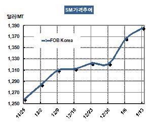 SM 가격은 1월13일 FOB Korea 톤당 1385달러로 19달러 상승했다. SM 생산기업들은 나프타(Naphtha)와 벤젠(Benzene) 가격 상승을 지적하며 상대적으로 SM 가격이 낮아 수익성이 악화되고 있다고 주장했다. 표, 그래프: < SM 가격추이 > <화학저널 2012/01/18> |