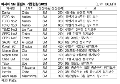 아시아 SM(Styrene Monomer) 시장의 공급과잉이 해소되기 어려울 전망이다. Asahi Kasei는 Mizushima 소재 39만톤 플랜트를 3월6일부터 3월 말까지, Idemitsu도 Chiba 소재 21만톤 플랜트를 3월 중순부터 한달간 정기보수한다. 표, 그래프: < 아시아 SM 플랜트 가동현황(2012) > <화학저널 2012/01/18> |