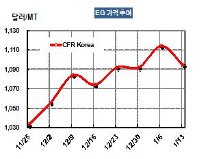 MEG 가격은 1월13일 CFR China 톤당 1099달러로 20달러 하락했다. 시장 관계자는 “MEG 저장탱크가 넘친다는 말이 나올 정도로 재고 확보가 끝난 상황”이라고 전했다. 표, 그래프: < EG 가격추이 > <화학저널 2012/01/19> |