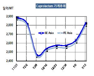 CPL 가격이 폭등했다. 시장 관계자는 “대부분의 중국기업들이 구정연휴로 문을 닫기 때문에 현물시장 구매기업들의 수가 급격히 줄었다”며 “수요가 구정연휴 이후 회복될지는 확실하지 않다”고 우려했다. 표, 그래프: < Caprolactam 가격추이 > <화학저널 2012/01/19> |