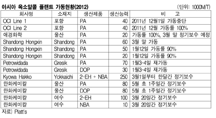아시아 PA(Phthalic Anhydride) 시장의 수급타이트가 완화될 것으로 예상된다. 애경화학은 PA 2만톤 플랜트를 풀가동하고 있다. 표, 그래프: < 아시아 옥소알콜 플랜트 가동현황(2012) > <화학저널 2012/01/19> |