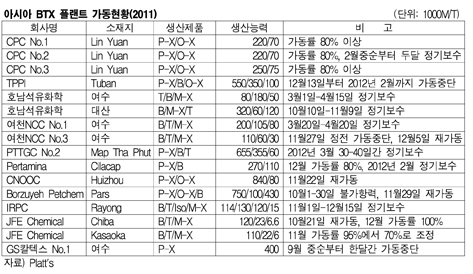 아시아 아로마틱(Aromatics) 시장은 가동률 조정이 이루어지면서 가격이 상승세로 전환되었으며 정기보수를 앞두고 있어 당분간 상승세를 지속할 것으로 예상된다. 벤젠 역시 국제유가 상승에 힘입어 상승세를 이어가고 있어 정기보수 시즌 동안 추가상승이 불가피할 것으로 예상되고 있다. 표, 그래프: < 아시아 BTX 플랜트 가동현황(2011) > <화학저널 2012/01/20> |