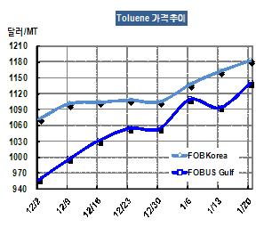 톨루엔 가격은 1월21일 FOB Korea 톤당 1182달러로 20달러 상승했다.