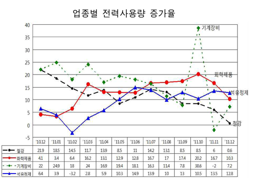 12월 전력 판매 증가세가 둔화됐다. 표, 그래프: < 업종별 전력사용량 증가율 > <화학저널 2012/01/25> |