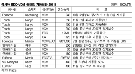 표, 그래프: < 아시아 EDC-VDM 플랜트 가동현황(2011) > <화학저널 2012/01/25> |