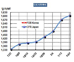 O-X 가격은 1월20일 FOB Korea 톤당 1605달러로 35달러 상승했다. 2월 공급물량은 CFR China 톤당 1670달러에 오퍼됐으나 3월 물량은 톤당 1640달러에 머물렀다. 표, 그래프: < O-X 가격추이 > <화학저널 2012/01/27> |