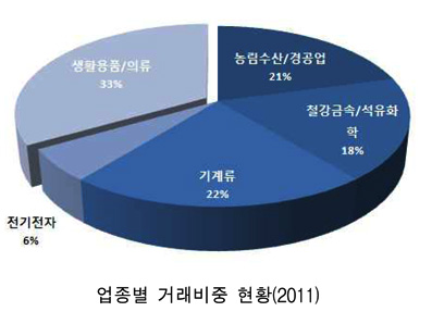 중소기업 1963사가 한국무역협회를 통해 1억7000만달러의 수출계약을 성사시킨 것으로 나타났다. 표, 그래프: < 업종별 거래비중 현황(2011) > <화학저널 2012/01/27> |