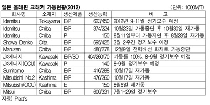 일본 올레핀 시장은 공급과잉이 지속되는 가운데 2012년 정기보수가 분산돼 정기보수로 인한 수급타이트가 없을 것으로 예상된다. 에틸렌 가격은 3월 여천NCC 및 호남석유화학의 정기보수를 앞두고 상승세로 전환됐으나 일본 크래커의 정기보수가 Showa Denko를 제외하고는 예정된 것이 없어 당분간 수급타이트가 나타나지 않을 것으로 예상되고 있다. 표, 그래프: < 일본 올레핀 크래커 가동현황(2012) > <화학저널 2012/01/27> |