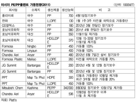 표, 그래프: <아시아 PE/PP 플랜트 가동현황(2011)> <화학저널 2012/01/30> |