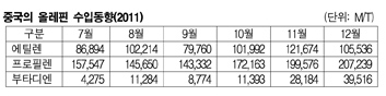 표, 그래프: < 중국의 올레핀 수입동향(2011) > <화학저널 2012/01/31> |