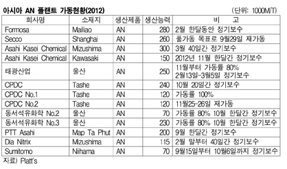 표, 그래프: < 아시아 AN 플랜트 가동현황(2012) > <화학저널 2012/02/02> |