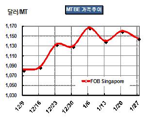 MTBE 가격이 소폭 하락했다. 중국 춘절연휴의 영향으로 Methyl Oxygenate 수요가 부진한 가운데 생산기업들도 적극 판매에 나서지 않고 있는 것으로 알려졌다. 표, 그래프: < MTBE 가격추이 > <화학저널 2012/02/03> |