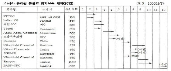 표, 그래프: < 아시아 올레핀 플랜트 정기보수 계획(2012) > <화학저널 2012/02/06> |