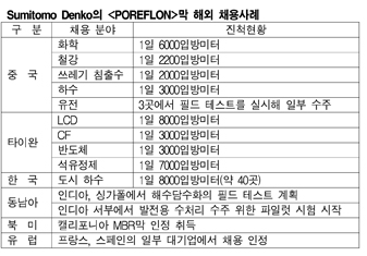 Sumitomo Denko가 수처리 사업을 확대한다. 최근 신흥국에서 환경 규제가 엄격해지면서 수처리막 수요가 급증하고 있기 때문이다. 표, 그래프: < Sumitomo Denko의 <POREFLON>막 해외 채용사례 > <화학저널 2012/02/07> |