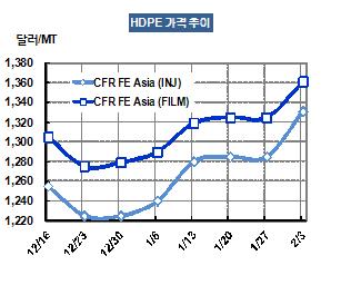 HDPE 가격은 2월2일 CFR FE Asia 톤당 1331달러로 46달러 폭등했다. 그러나 PE 가격이 지나치게 오름에 따라 중국의 수요기업을 중심으로 구매에 적극 나서지 않을 가능성이 높아 하락세 전환이 불가피해지고 있다. 표, 그래프: < HDPE 가격추이 > <화학저널 2012/02/07> |