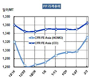 PP 가격은 2월2일 CFR FE Asia 톤당 1330달러로 32달러 급등했다. 그러나 프로필렌 가격이 15달러 상승하는데 그쳐 PE(Polyethylene)처럼 무역상들이 장난을 친 것이 아닌지 의심되고 있다. 표, 그래프: < PP 가격추이 > <화학저널 2012/02/07> |