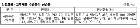 2012년 1월 수출물가가 2011년 12월에 비해 1.1% 상승했다. 석유화학제품은 벤젠(Benzene) 12.5%, PTA(Purified Terephthalic Acid) 7.0%, 자일렌(Xylene) 7.6%, 벙커C유 7.6%, ABS(Acrylonitrile Butadiene Styrene) 7.1% 오른 반면, 폴리에스터(Polyester) 필름 4.4%, 플래스틱 용기 6.0% 하락했다. 표, 그래프: < 석유화학․고무제품 수출물가 상승률 > <화학저널 2012/02/15> |