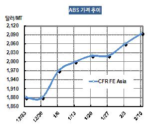 ABS 가격은 2월9일 CFR FE Asia 톤당 2095달러로 35달러 상승했다. 부타디엔(Butadiene)이 FOB Korea 톤당 3850달러로 폭등하는 등 폭등현상을 지속하고 있기 때문이다. 표, 그래프: < ABS 가격추이 > <화학저널 2012/02/15> |