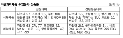 2012년 1월 수입물가가 2011년 12월에 비해 0.8% 상승했다. 석유제품은 나프타(Naphtha)가 5.7%, 프로판(Propane) 10.2%, 부탄(Butane) 10.8%, 휘발유 8.1% 등 대부분의 제품이 올랐으며, 1년 전에 비해서도 나프타 12.2%, 벙커C유 51.6%, 휘발유 18.3% 상승해 높은 수준을 형성했다. 표, 그래프: < 석유화학제품 수입물가 상승률 > <화학저널 2012/02/15> |
