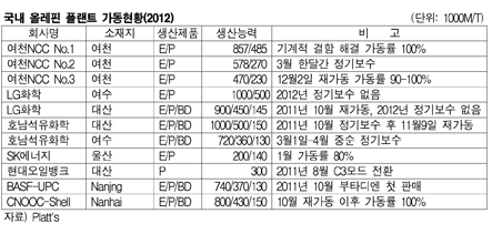 국내 올레핀 시장이 가동률 과잉현상을 보이고 있다. 호남석유화학은 11월 정기보수 이후 대산 소재 에틸렌 100만톤, 프로필렌 50만톤, 부타디엔(Butadiene) 15만톤 크래커를 정상가동하고 있고, 여수 소재 에틸렌 72만톤, 프로필렌 37만톤, 부타디엔 13만톤 크래커는 3월1일부터 45일간 정기보수할 방침이다. 표, 그래프: < 국내 올레핀 플랜트 가동현황(2012) > <화학저널 2012/02/17> |