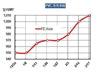 PVC 가격은 2월15일 CFR FE Asia 톤당 1010달러로 10달러 상승했다. 특히, PVC 수요기업들은 1000달러도 경쟁적이지 않다는 이유로 구매할 의사가 없다고 표명해 거래하지 못했다. 표, 그래프: < PVC 가격추이 > <화학저널 2012/02/20> |