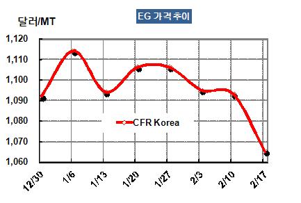 MEG 가격은 2월17일 CFR China 톤당 1065달러로 33달러 하락했다. 폴리에스터는 섬유사 생산기업들의 재고가 2-4주에 달함으로써 생산-판매 비율이 70% 수준으로 크게 떨어졌다. 표, 그래프: < EG 가격추이 > <화학저널 2012/02/20> |