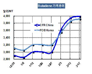 부타디엔 가격은 2월17일 FOB Korea 톤당 3921달러로 71달러 급등했다. 중국은 합성고무 생산기업들이 가동을 중단하거나 가동률을 낮추면서 수급타이트가 완화됐으나 CFR China 톤당 3990달러로 50달러 상승했다. 표, 그래프: < Butadiene 가격추이 > <화학저널 2012/02/22> |