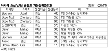 아시아 초산(Acetic Acid) 시장이 수익성 압박으로 고전하고 있다. 한편, VAM(Vinyl Acetate Monomer) 시장 역시 공급과잉이 확대되면서 가동률 조정이 이루어지고 있다. 표, 그래프: < 아시아 초산/VAM 플랜트 가동현황(2012) > <화학저널 2012/02/27> |
