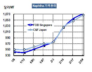 나프타 가격은 2월25일 CFR Japan 톤당 1067달러로 20달러 상승했다.